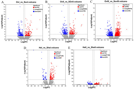 Volcano plots of DEGs. (A) Volcano plot of DEGs identified from OvI_vs_SOvI, (B) OvII_vs_SOvII, (C) OvIII_vs_SOvIII, (D) HeI_vs_SHeI, and (E) HeII_vs_SHeII. Red and blue dots indicate significantly up- and downregulated transcripts, respectively. Gray dots represent transcripts with non-significant differences.