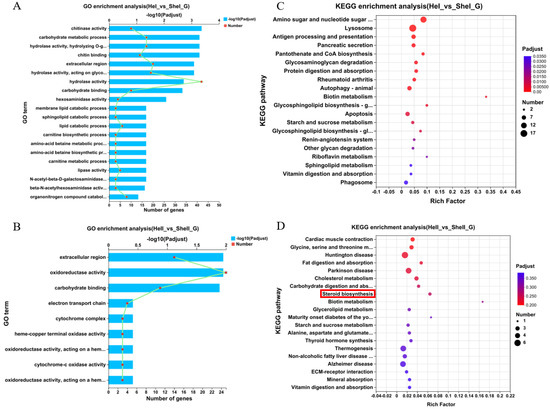 Figure 4A,B showed the top 20 GO terms that were enriched in hepatopancreas samples collected 1 day after eyestalk ablation (e.g., hydrolase activity, carbohydrate activity, and extracellular region) and 6 days after eyestalk ablation (e.g., oxidoreductase activity, extracellular region, and carbohydrate binding), respectively. Further, Figure 4C,D showed that the top 20 KEGG pathways were significantly enriched in hepatopancreas samples collected at different timepoints. Amino sugar and nucleotide sugar metabolism, lysosome, and antigen processing and presentation were enriched in the HeI_vs_SHeI group at 1 day after eyestalk ablation, while steroid biogenesis and fat digestion and absorption were enriched in the HeII_vs_SHeII group at 6 days after eyestalk ablation.