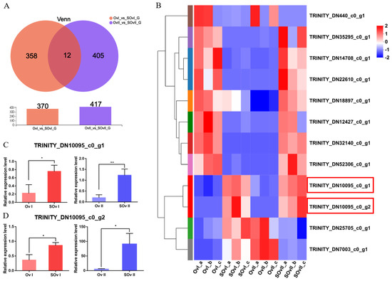 DEGs in the ovary. (A) Venn diagram of DEGs at 1 and 6 days after eyestalk ablation in E. carinicauda. (B) Heatmap of the 12 overlapping genes. (C) Validation of TRINITY_DN10095_c0_g1 and (D) TRINITY_DN10095_c0_g2 expression levels by real-time PCR at different timepoints (* p < 0.05, ** p < 0.01).