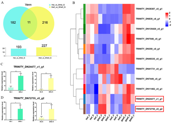To identify genes related to the early development of the ovary, we performed overlap analyses using the OvI_vs_SOvI and OvII_vs_SOvII gene sets, followed by cluster analyses. Twelve DEGs were found to be potentially related to ovarian development during the early stage (Figure 5A,B). TRINITY_DN10095_c0_g1 and TRINITY_DN10095_c0_g2 were focused as the expression level was higher after eyestalk ablation which might play roles during ovary development. Meanwhile, 11 DEGs were identified on overlap analyses using the HeI_vs_SheI and HeII_vs_SheII gene sets (Figure 6A,B). The expression of TRIN-281ITY_DN24477_c1_g1 and TRINITY_DN72755_c0_g2 was also upregulated after eyestalk ablation. The expression of the four transcripts was verified by real-time PCR (Figure 5C,D and Figure 6C,D), and were found to be consistent with transcriptome data. However, the specific function of these genes needs to be further determined using other experimental methods.