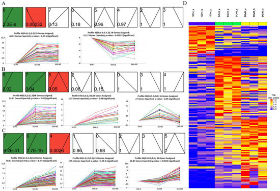 STEM analysis to assess temporal expression trend of DEGs in the ovary at different timepoints. (A) Two, (B) three, and (C) three temporal expression profiles of DEGs from OvI_vs_SOvI, OvII_vs_SOvII, and OvIII_vs_SOvIII, respectively. (D) Heatmap of DEGs from different groups of ovaries.