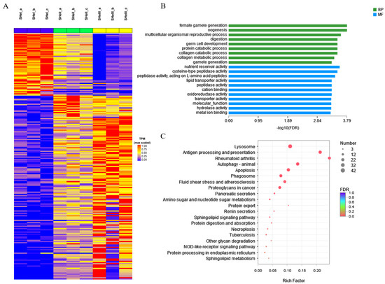 STEM analysis of DEGs in the hepatopancreas. (A) Heatmap of DEGs from different groups of the hepatopancreas. (B) GO and (C) KEGG pathway enrichment analysis of DEGs by time course.