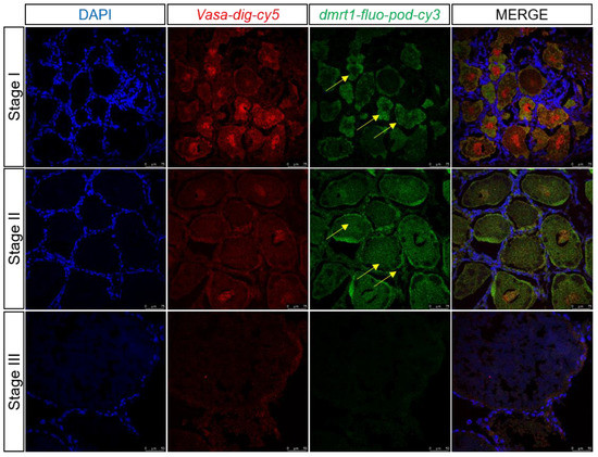 Two-color fluorescent in situ hybridization showing expression profiles of dmrt1 and vasa in the ovary at different stages (scale, Stage I, II: 75 μm; Stage III: 50 μm). Blue signal: DAPI; red signal: vasa; and green signal: dmrt1.The yellow arrow marks the green signal.