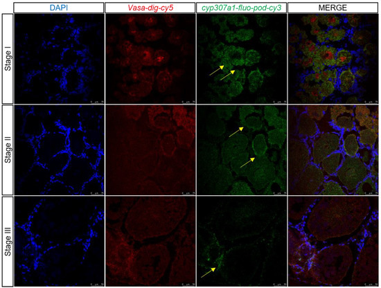 Two-color fluorescent in situ hybridization showing expression profiles of cyp307a1 and vasa in the ovary at different stages (scale, Stage I, II: 75 μm; Stage III: 50 μm). Blue signal: DAPI; red signal: vasa; and green signal: cyp307a1. The yellow arrow marks the green signal.