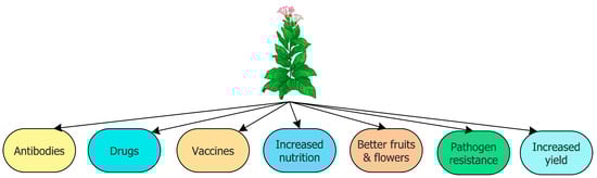 Plant biotechnology has two main objectives: (i) the use of plants as a means of producing a wide range of products that have been previously synthesized using recombinant bacteria, fungi, or animal cells in culture, and (ii) the creation of new, unique, and better-performing varieties of crop plants. Some of the new and unique varieties of crop plants include plants resistant to insects, viruses, and herbicides; plants with increased nutritional content; plants that are resistant to a range of abiotic environmental stresses such as high levels of soil salinity and drought; plants with modified fruits and flowers; plants that are resistant to a wide range of fungal and bacterial pathogens; and plants with a significant increase in yield. In addition, the most prominent products that are either currently produced in plants or are being developed for eventual production in plants include antibodies and antibody fragments; human and animal vaccines; and a wide range of animal and human therapeutic agents (Figure 1).