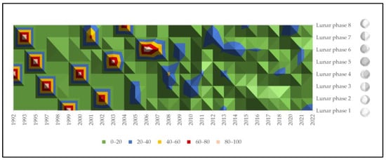 The relative frequency of the spontaneous onset of labor across lunar phases over the study period did experiment with a change in its quantitative trend (Figure 1). During the first decade, most of the annual deliveries were concentrated in the lunar phases of waning crescent to new moon (Lunar phase 4), new moon to waxing crescent (Lunar phase 5), and waxing crescent to the first quarter (Lunar phase 6). However, a relatively homogeneous proportion of the onset of labor events between lunar phases from the beginning of the 2000s until the present can be noticed. However, a comparatively superior predominance of the aforementioned lunar phases is still patent.