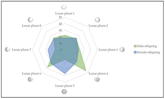 Regarding the proportion of newborns of each sex that were born in a certain lunar phase throughout the entire study period, male offspring are usually born under lighter conditions (Lunar phases 4 and 6) than female calves (Lunar phase 5). This observation would be explained based on specific strategies of female dromedaries for the promotion of the survival of the offspring based on their sex, taking into consideration that survival, growth, immunity, and organ development in mammals species are higher for female newborns than their male counterparts at neonatal stages [97,98].