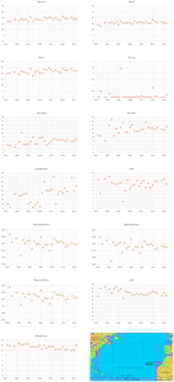 Interannual variation in the mean values for weather variables at the onsets of parturition registered each year. A map with the geographical location of the study area (black circle) is included at the bottom right of the figure. MeanT: Mean temperature, MinT: Minimum temperature, MaxT: Maximum temperature, Precip: Precipitation, MeanWS: Mean wind speed, MaxWG: Maximum wind gust, DirMaxWG: Direction of the maximum wind gust, HoS: Hours of sunshine, MeanAtmPress: Mean atmospheric pressure, MinAtmPress: Minimum atmospheric pressure, MaxAtmPress: Maximum atmospheric pressure, RH: Relative humidity, MeanVisib: Mean visibility.