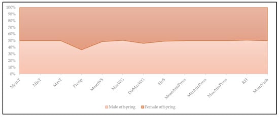 One hundred percent stacked area graph for the comparison of mean values for weather variables at the onsets of parturition depending on the sex of offspring over the study period. MeanT: Mean temperature, MinT: Minimum temperature, MaxT: Maximum temperature, Precip: Precipitation, MeanWS: Mean wind speed, MaxWG: Maximum wind gust, DirMaxWG: Direction of the maximum wind gust, HoS: Hours of sunshine, MeanAtmPress: Mean atmospheric pressure, MinAtmPress: Minimum atmospheric pressure, MaxAtmPress: Maximum atmospheric pressure, RH: Relative humidity, MeanVisib: Mean visibility.
