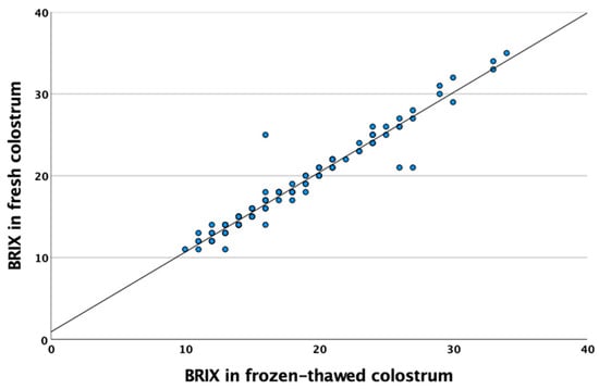 Correlation plots and trend line between fresh and frozen colostrum samples assessed by Brix refractometer.