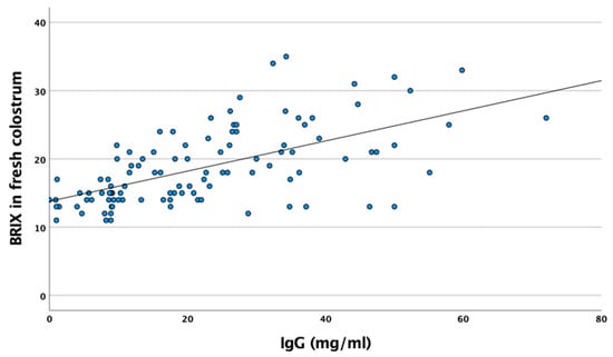 Relation between Brix value measured by optical refractometer and IgG concentration measured by ELISA in fresh colostrum.