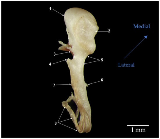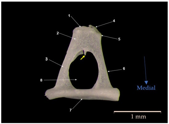 In the medial and caudal directions, the head of the stapes continues with the two crura that connect to the basis of the stapes, the footplate (7). The two crura have slightly divergent directions and delimit a circular space in the intercrusal foramen (8). Specifically, the posterior crus (6) is more straight and slightly thicker than the anterior one (3). In one specimen, a fragment of a bony spicule (Figure 5) was visible, which was determined to be a remnant of the stapedial artery [].
