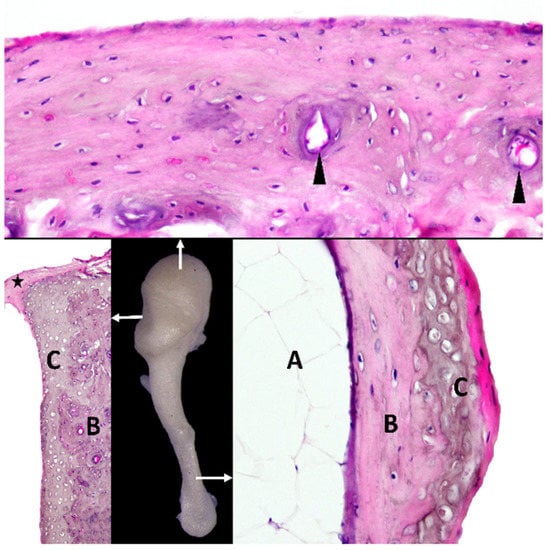 Histological aspects of malleus. Arrows indicate areas selected for histology. A—marrow cavity with adipocytes; B—subchondral compact bone; C—hyaline cartilage; arrowheads—blood vessels; star—incudomalleolar joint capsule with dense regular connective tissue.