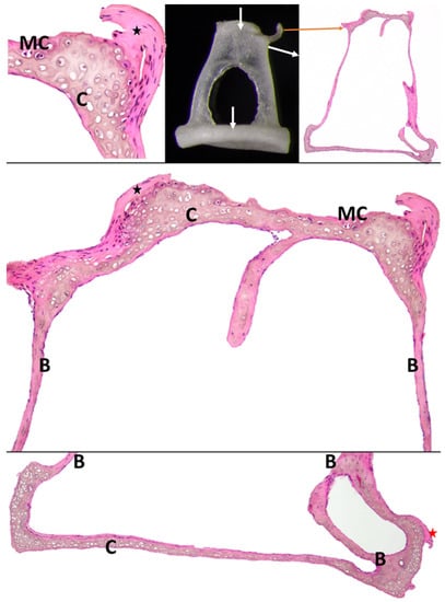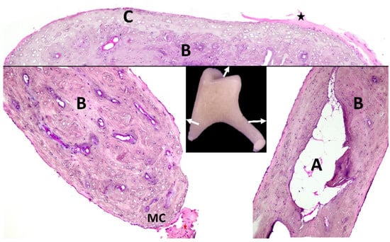 Histological aspects of the incus. Arrows indicate areas selected for histology. A—marrow cavity filled with adipocytes; B—compact bone; C—articular hyaline cartilage; black star—incudomalleolar ligament; MC—mineralized cartilage with posterior incudal ligament (red star).