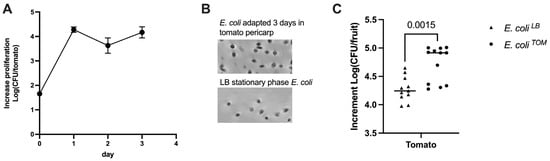We further determined whether pre-adaptation of E. coli in tomato pericarp (E. coli TOM) would support an increase in proliferation if transferred to other vegetables. Therefore, other tomato fruits were contaminated with the E. coli TOM strain and the E. coli originating from a stationary LB culture (E. coli LB) (no evident differences in cell morphology were observed in these two bacterial populations used for fruit contamination, Figure 1B). It is reasonable to assume that the pre-adaptation of E. coli TOM would be advantageous, growing at a higher rate when transferred into a new vegetable when compared to E. coli LB. This hypothesis was confirmed, showing that E. coli TOM had an increased—although limited—proliferation in tomatoes of log 4.7 CFU/fruit versus the log 4.2 CFU/fruit of E. coli LB (Figure 1C). Thus, pre-adaption positively affected E. coli fitness even when new vegetables were contaminated.