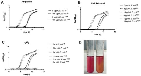 Different growth of E. coli TOM and E. coli LB in different conditions. Growth curves of E. coli TOM and E. coli LB in the presence/absence of (A) ampicillin (control), (B) nalidixic acid, and (C) H2O2; (D) different acidification by E. coli TOM (left tube) and E. coli LB (right tube) into semi-solid MacConkey, possibly indicating different motility. Error bars represent standard error.