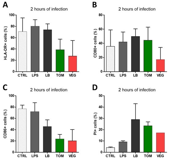 A similar trend was observed with a reduction in the percentage of CD80+ cells in the presence of non-contaminated tomatoes. Regarding viability, the percentage of necrotic PI+ cells tended to increase compared to the controls (i.e., non-infected mDCs and mDCs grown in the presence of LPS), reaching about 20–30% in case of infection with E. coli TOM and E. coli LB. However, these differences were not found to be statistically significant.