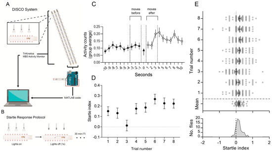 The number of beam crossings (counts) was measured by the DISCO apparatus for each second, and the lights-off stimuli presentation was controlled and recorded by the MATLAB-Arduino system. The raw data output from DISCO was converted to CSV files using the DamFileScan software from TriKinetics. A custom-made MATLAB routine was used to calculate the movement response to stimuli by subtracting the average movement counts for 3 s after a given stimulus from the baseline measure 3 s before the same point, disregarding the exact second in which the stimulus was presented, here named as startle index. Similar MATLAB routines can be found as supplementary material in a previous article describing the DISCO platform [30].