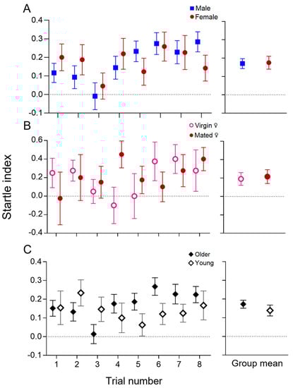 Next, we sought to further characterize the nature of the immediate movement response to lights-off stimuli. As it has been shown that male and female flies can differ in many light-related behaviors, including daily activity and motion responses [38,39,40], we separated males and females from our sample (Figure 1D) and assessed if there were sex variations in the startle index (Figure 2A). Two-way ANOVA showed no significant difference among male and female responses (p = 0.985). There was a significant effect of the trial number on the startle index (p = 0.012), likely caused by the incidental reduction of movement response on trial number 3 from both groups; however, no effects of sex-trial interactions were observed (p = 0.467). Moreover, mating experience induces physiological changes that also can modulate the flies’ locomotion, especially for female Drosophila [41]; thus, we compared the reaction to lights-off stimuli from virgin and mated female flies (Figure 2B). Likewise, no significant differences could be found among the conditions (p = 0.809). With this independent sample, no trial number or interaction effects were detected (p = 0.751 and p = 0.361, respectively). Additionally, we tested if younger adult flies (1 to 3 days old) behaved differently from older adult flies (5 to 7 days old, same as Figure 1D) when the stimuli were presented, as the maturation of the nervous system could affect sensory processing (Figure 2C). Once more, the two-way ANOVA analysis did not find any significant differences between the two age groups (p = 0.373), and no influence from trials (p = 0.394) or age-trial interaction (p = 0.096). The mean values of startle index from the 8 trials for all groups were significantly greater than baseline response (p = 0.027 and p = 0.024 for virgin and mated females, respectively; for all other groups, p < 0.0001).