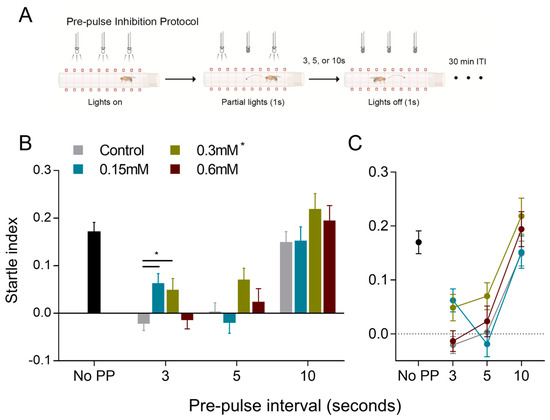 The following supporting information can be downloaded at: https://www.mdpi.com/article/10.3390/biology12040635/s1, Figure S1: Effects of 0.15 mM MK-801 on prepulse inhibition; Figure S2: Effects of 0.3 mM MK-801 on prepulse inhibition; Figure S3: Effects of 0.6 mM MK-801 on prepulse inhibition; Figure S4: Response to lights-off stimuli after MK-801 administration; File S1: Statistical Tables.