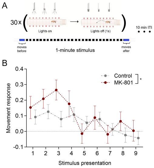 Desensitization to startle-inducing stimuli is affected by MK-801. (A). By repeatedly presenting the lights-off stimulus for one minute and by reducing the interval between trials of lights-off stimuli presentation, we tested if the motor response could be inhibited. (B). For the first four trials, both groups presented startle responses significantly over baseline and negligible responses afterwards, demonstrating the stimuli desensitization over time (two-way ANOVA, ptrial = 0.0006). Nevertheless, MK-801 exposure evoked a distinct movement response (pMK-801 = 0.043), although no interaction effect was observed (pinteraction = 0.519). Values are shown as mean ± SEM. * p < 0.05.