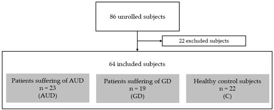 Enrolled subjects in the study. Abbreviations: AUD, alcohol use disorder; GD, gambling disorder; C, healthy controls.
