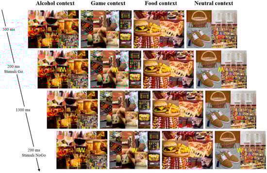 The task consisted of four Go/NoGo blocks of 200 stimuli each (140 Go and 70 NoGo). Each block had a different context generated by an image of alcohol, gambling, food, or a neutral context displayed in the background throughout each block (Figure 2). The order of the contexts was counterbalanced across participants. The Go or NoGo (M or W) signal was presented for 200 ms, and then the signal disappeared for 1300 ms, leaving 1300 ms for the participant to respond. The order of stimulus presentation was pseudorandomized, so that no two NoGo were presented after each other and no more than four Go were presented before a NoGo.