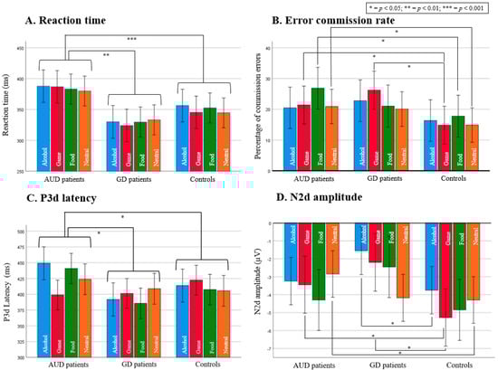 (A) Reaction time for correct detections of contextual Go/NoGo tasks; (B) Percentage of commission errors for each contextual Go/NoGo task; (C) P3d latency for each contextual Go/NoGo task; (D) N2d amplitude for each contextual Go/NoGo task. Error bars represent two standard deviations. Abbreviations: AUD, alcohol use disorder; GD, gambling disorder; ms, milliseconds; µV, micro volt.