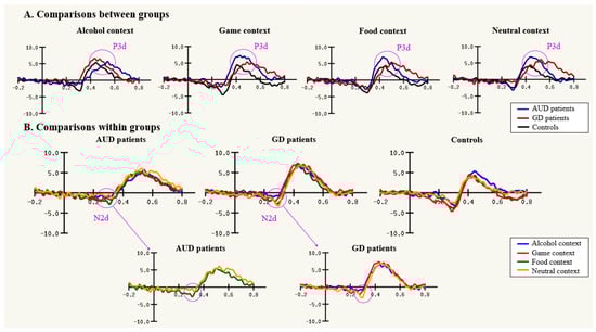 (A) Illustration of the event-related potential components of the inhibition responses (N2d and P3d) on the Cz electrode during contextual Go/NoGo tasks. (B) Comparison within groups between contexts with main differences on the N2d. The unit is in milliseconds on the ordinate and in microvolt on the abscissa. Abbreviations: AUD, alcohol use disorder; GD, gambling disorder.