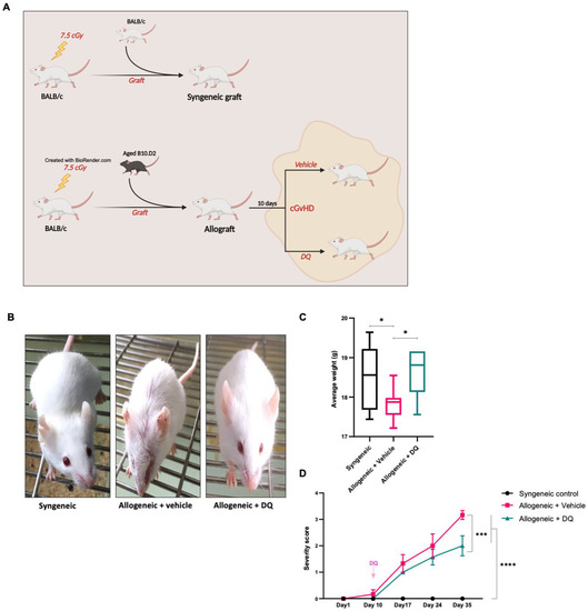In this study, we set out to test the therapeutic efficacy of the senolytic combination of dasatinib and quercetin (DQ) in an experimental murine model of cGVHD. Experimental cGVHD was induced in sublethally irradiated BALB/c mice upon transplantation of allogeneic grafts from B10.D2 mice. The typical characteristics of murine cGVHD include skin and ear fibrosis, eyelid sclerosis, alopecia, changes in the immune profile, and the presence of pro-inflammatory cytokines in major organs such as liver, lungs, and gut [26,27]. The phenotypic changes and organ pathology bear striking similarities with clinical cGVHD, an autoimmune-like inflammatory disease that typically affects multiple organs, including skin (75%), oral mucosa (51–63%), liver, eyes and the gastrointestinal (GI) tract (22–51%) [28].