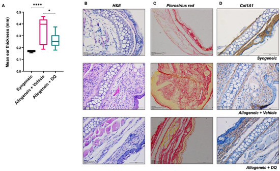 We next assessed DQ’s ability to mitigate established signs of murine cGVHD, including ear/skin thickness, an index of skin fibrosis and one of the classical signs associated with cGVHD in mice. Results clearly showed an increase in ear thickness in allogeneic graft recipients compared to the syngeneic controls, which was notably reduced upon treatment with DQ (Figure 2A). Corroborating that, H&E staining of tissue sections from the ears of mice in the respective groups indicated enhanced fibrosis in allogeneic recipients (cGVHD) compared to the syngeneic group, which was partially reduced upon treatment with DQ (Figure 2B–D and Figure S1A–C). The latter was further validated by picrosirius red staining and collagen (Col1A1) expression, which confirmed the inhibitory effect of DQ on increased collagen content upon allogeneic grafting (Figure 2C,D and Figure S1B,C). A similar effect of DQ was observed in skin sections of allogeneic graft recipients (Figure 2E–G and Figure S2A–C). Skin sections were further examined for MPO+ neutrophil infiltration. Interestingly, allograft recipient mice displayed lower MPO+ staining as compared to their syngeneic counterparts, suggesting the clearance of exhausted neutrophils at the late stage of cGVHD (Figure 2H and Figure S2E). We were unable to discern a significant difference in α-SMA in ear and skin sections between the allogenic and syngeneic graft recipients; however, a significant reduction was observed in the DQ-treated allogeneic graft recipients (Figure S1D and Figure S2D). Moreover, the marginal increase in p16 expression in skin sections of allogenic recipients was reduced upon treatment with DQ (Figure 2I and Figure S2F).