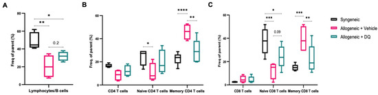 3.3. DQ Significantly Inhibits Allograft Associated Increase in Circulating Memory T Cells without Significantly Affecting the Decrease in B Cell Subsets