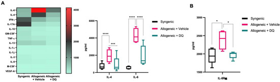 DQ treatment modulates cytokine secretion and protein expression associated with GVHD in allogeneic recipients. (A) 15-plex ELISA profiling of key inflammatory cytokines in the three groups of animals. IL-4 and IL-6 levels in the three groups were plotted and two-way ANOVA was used for statistical significance (*** = p < 0.001, **** = p < 0.0001). (B) IL-8Rα secretion in syngeneic and allograft recipients was measured using ELISA. One-way ANOVA was used for statistical significance (* = p < 0.05).