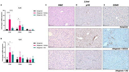 DQ targets senescent cells in liver. (A,B) mRNA expression levels of IL-8 and IL-6 produced by liver, colon, and lung cells were determined by qPCR. Two-way ANOVA was used for statistical significance (* = p < 0.05, ** = p < 0.01, **** = p < 0.0001). (C–E) Representative images of H&E stain (40×) (C), p16 (20×) (D), and CD45 (40×) (E) in liver tissue sections from mice in the syngeneic, allogeneic, and allogeneic + DQ groups.