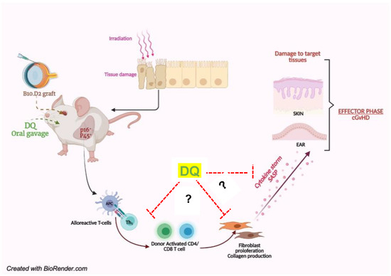 Our results support the hypothesis that accumulation of senescent cells, probably following irradiation of the recipient animal and subsequent allogeneic grafting, is a contributing factor underlying cGVHD, and its therapeutic targeting by senolytics such as DQ augurs well as a potential strategy against this life-threatening sequela of allogeneic transplantation (schematic Figure 6). Several senolytic approaches have been adopted in recent years to target senescent cells, namely, curcumin analogues, quercetin nanoparticles, exosomal carriers of embryonic stem cells, small-molecule compounds that target the anti-apoptotic protein Bcl-2, and nanoparticles targeting SASP proteins [43,44,45,46,47,48,49,50,51,52,53]. Many of these strategies have shown promise in models of cGVHD, thus supporting a role for senescent cell populations and secretory chemokines/cytokines in the pathogenesis of the disease [7,14,54,55]. More importantly, previous studies have found a profound impact of DQ in the treatment of inflammatory disorders and fibrotic disease [56,57,58]. Laying our rationale on these foundations, our results highlight the therapeutic potential of DQ in mitigating cGVHD progression through the removal of senescent cells in the liver of allograft recipients.