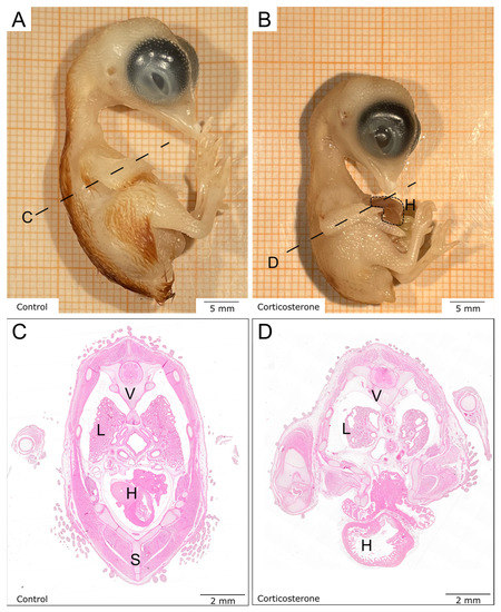 Prenatal stress exposure impairs overall development of avian embryos. The macroscopic images show lateral views of chicken embryos on E13. The control embryo (A) is further developed than the much smaller cort-exposed embryo (B). The open chest wall with the protruding heart is marked by a dotted line in (B). The transversal lines indicate the sectioning level for the histological sections (C,D). The control section (C) shows larger organs and a regular anatomy in comparison with the cort-exposed embryo section (D), which presents with an open chest wall and reduced organ size. H: heart, L: lungs, S: sternum, V: vertebrae.