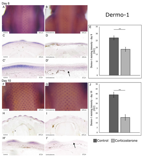 On E8—2 days after systemic prenatal stress exposure—the expression pattern of Dermo-1 was disturbed in cort-exposed embryos (Figure 2A–E). The control embryos showed extensive transcripts of Dermo-1 in the dorsolateral skin. Moreover, the first row of developing feather buds in the median line on the back of control embryos was positive for Dermo-1 (Figure 2A). The cort-exposed embryos showed an overall weaker expression of Dermo-1 in the dorsal skin, and a reduction in quantity of Dermo-1-positive feather buds (Figure 2B). The vibratome sections further showed that Dermo-1 expression was reduced in cort-exposed embryos (Figure 2C,D’, arrow). The quantification confirmed a significant decrease in Dermo-1 expression, indicated through a reduced ISH staining intensity by 30.5% in the cort-exposed group (Figure 2E; p < 0.001; control: n = 8; cort: n = 8).