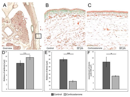 Prenatal stress alters the composition of the different skin layers. The images and diagrams show the influence of prenatal systemic stress exposure on the composition of the different skin layers. (A) shows an orientation overview of a transversal paraffine section stained with a Masson–Goldner–Trichrome staining in which the connective tissue appears green. The square indicates the region in the dorsolateral interlimb region from which the skin was analyzed and compared. (B) shows the skin of a control embryo. (C) shows the skin of a cort-exposed embryo. Note the reduction in dermis thickness and cell density for the cort-exposed embryo. The diagrams compare different parameters of skin composition such as the thickness of the epidermis (D), the thickness of the dermis (E), and the cell density in the subcutaneous mesenchymal layer (F). The data are presented as mean ± standard error (control: n = 5; cort: n = 5). * p < 0.05; *** p < 0.001; n.s.—not significant.