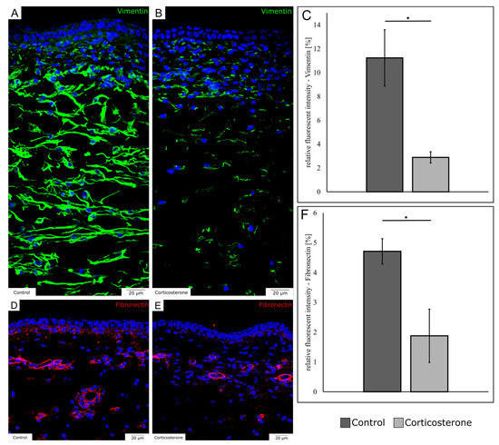 The images demonstrate the decrease in the expression of mesenchymal markers in the skin on E13. The images (A) (control) and (B) (corticosterone) show the immunohistochemical detection of vimentin. Note the reduction of vimentin expression in the dermis and subcutaneous mesenchyme. (C) shows the respective quantification of the fluorescent intensity. The images (D) (control) and (E) (corticosterone) show the immunohistochemical detection of fibronectin. Note the reduction of fibronectin expression in the dermis. (F) shows the respective quantification of the fluorescent intensity. The data are presented as mean ± standard error (control: n = 3; cort: n = 3). * p < 0.05.