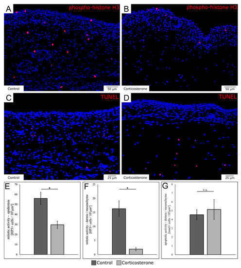 For the dermis and the subdermal mesenchyme, the number of mitotic cells was significantly reduced by 88.4% in the cort-exposed embryo group (Figure 5F; p = 0.026; control: n = 3; cort: n = 3).