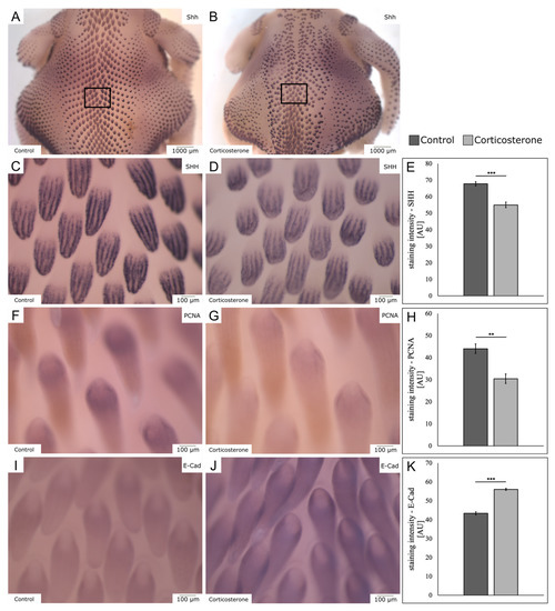 The images demonstrate skin appendage formation using different markers for whole-mount in situ hybridization on E11, 5 days after systemic stress exposure. (A,B) display an exemplary dorsal overview of Sonic hedgehog (SHH) for the control and cort-exposed embryos. The squares indicate the areas of further comparison. (C,D) compare the expression of SHH in higher magnification. (E) displays the respective quantification for SHH. (F,G) demonstrate expression of proliferating cell nuclear antigen (PCNA). (H) displays the respective quantification for PCNA. (I,J) show the expression of E-cadherin (E-Cad) for both the control and cort-exposed embryos. (K) displays the respective quantification for E-Cad. The data are presented as mean ± standard error (control: n = 5; cort: n = 5). ** p < 0.01; *** p < 0.001.