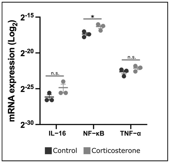 For Interleukin-16 (IL-16) and tumor necrosis factor-α (TNF-α), the transcriptional changes between the control and the cort-exposed groups were insignificant (Figure 7; p = 0.141 and p = 0.095, respectively; control: n = 3; cort: n = 3).