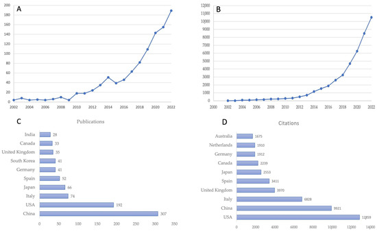 The number of publications (A) and citations (B) between 2002 and 2022; the top 10 most productive countries in terms of publications (C) and citations (D), in ascending order. All numbers are derived from Dimensions on 25 January 2023.