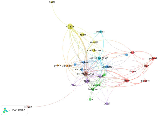 The software VOSviewer was used to investigate cooperation across countries. Figure 2 depicts the 32 countries with the highest co-authorship productivity. The minimum number of documents and citations is set to four. The co-authorship analysis of countries reveals the collaboration between countries in this field as well as the level of collaboration. The larger circles reflect the most productive countries in the field; the thickness and length of the links between nodes represent the cooperative relationship between countries. The proximity of the objects also indicates the degree of their connection. Colors represent the clustering of the items. China, the USA, and Italy dominate the scientific scenario in this field both in terms of the number of publications and in terms of the number of citations. There are eight distinct clusters of cooperative relationships between nations, each distinguished by a distinct color. The United States had the highest overall link strength with 192 documents and a link strength of 125, followed by China with 307 documents and a total link strength of 57. Spain came in third place with 52 documents and 50 total link strengths. The United Kingdom, with 35 documents and a link strength of 43, is second, followed by Canada, with 33 documents and a link strength of 40, and Italy, with 74 documents and a link strength of 39.