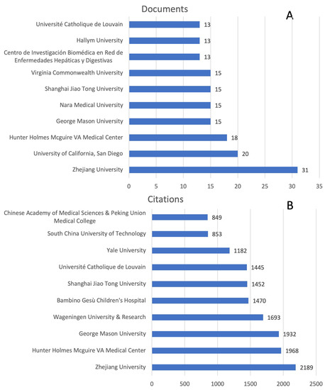 The research on the role of the gut microbiome in the progression of NAFLD, NASH and cirrhosis, and its connection with biotics was supported by 1118 institutions. The top 10 institutions with the highest number of publications and citations are listed in Figure 3. The most prolific organization for publication is Zhejiang University (China), with 31 documents. The second and third positions are occupied by the University of California (San Diego, CA, USA) and Hunter Holmes Mcguire VA Medical Center (USA), with 20 and 18 publications, respectively. In the fourth position, we found several institutions with 15 publications: George Mason University, Nara Medical University, Shanghai Jiao Tong University, and Virginia Commonwealth University. The most cited institutions are, in order, Zhejiang University with 2189 citations, Hunter Holmes Mcguire VA Medical Center with 1968 citations, Wageningen University & Research (The Netherlands) with 1932 citations, and Wageningen University & Research with 1693 citations.