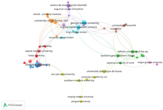 Collaboration network based on co-authorship productivity over the last 20 years between the major institutions. The different colors represent the different clusters formed by the groups of institutions; the degree of connection between the objects is also indicated by their proximity. The map depicts a network of nine clusters distinguished by different colors, which aid in understanding how the various institutions collaborate.