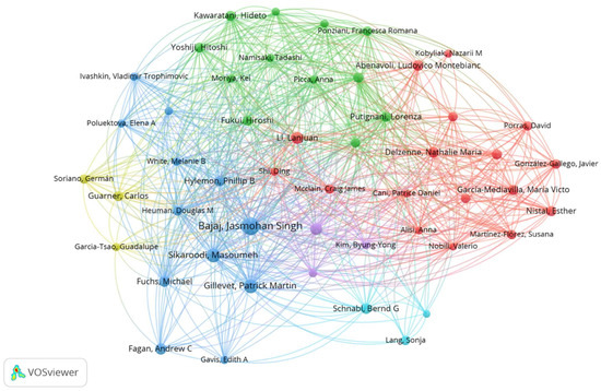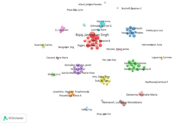 Cooperative relationships between authors can be more easily identified with the aid of visual mapping (Figure 5), which provides clear information about existing partnerships; authors from the top 100 researchers were used to create the visual map. The quantity of documents published by each author is represented by the diameter of the concentric circle, and the presence of connection lines denotes collaborative effort. Collaboration between authors is shown by the density of the connecting lines. In total, there are 14 clusters of different colors. In order, the largest clusters are cluster 1 (red color) and cluster 2 (green color). Cluster 1 is composed of several authors, including Bajaj, J.; Fagan, A.; Fuchs, M.; Gavis, E.; Gillevet, P.M.; Heuman, D.; Hylemon, P.B.; Sikaroodi, M.; and White, M.B. Moreover, cluster 1 shows direct cooperation with cluster 5 (blue color), which is composed of several authors including Demir, M.; Lan, S.; Loomba, R.; Martin, A.; and Scnabl, B.G. Cluster 2 is composed of several authors, including Alisi, A.; Del Chierico, F.; Gasparrini, A.; Nobili, V.; Picca, A.; Ponziani, F.R.; Putignani, L.; and Sterbini, F.P. As shown in Figure 5, some authors prefer not to constitute co-authorship and instead constitute individual clusters.