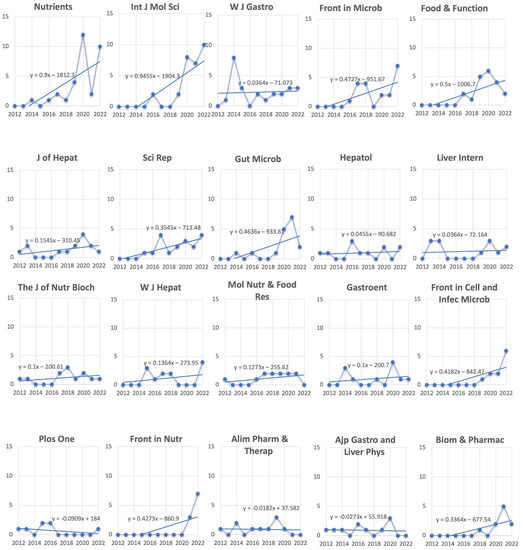 Publication trend of the 20 most prolific journals relative to the last 10 years. Y-axis represents the number of publications. For each graph is indicated the linear trend line and related equation. Int J Mol Sci = International Journal of Molecular Sciences; W J Gastro = World Journal of Gastroenterology; Front in Microb = Frontiers in Microbiology, J of Hepat = Journal of Hepatology; Sci Rep = Science Report; Gut Microb = Gut Microbiology; Hepatol = Hepatology; Liver Intern = Liver International; The J of Nutr Bioch = The Journal of Nutritional Biochemistry; W J Hepat = World Journal of Hepatology; Mol Nutr & Food Res = Molecular Nutrition & Food Research; Gastroent = Gastroenterology; Front in Cell and Inf Microb = Frontiers in Cellular and Infection Microbiology; Front in Nutr = Frontiers in Nutritions; Alim Pharm & Therap = Alimentary Pharmacology & Therapeutics; Ajp Gastro and Liver Phys = AJP Gastrointestinal and Liver Physiology; Biom & Pharmac = Biomedicine & Pharmacotherapy.