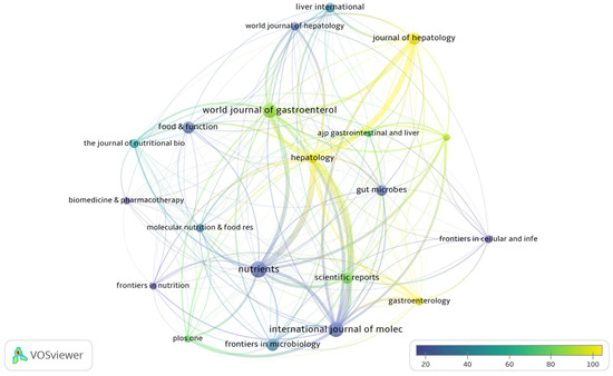 In Figure 8, the visual citation analysis shows the relationship in terms of citations between journals with at least 10 publications and 200 citations. The relatedness of journals is determined based on the number of times a journal cites another. The size of the concentric circle and the text denote the number of articles produced by the journals. The thickness of the connecting lines reflects the level of citation between journals. The degree of coloring from dark purple to yellow varies according to the average number of citations each journal achieved, with yellow accounting for the highest number. From the map, it can be seen that the journals that cite each other more frequently are the following: Nutrients, Hepatology, International Journal of Molecular Sciences, World Journal of Gastroenterology, Scientific Reports, and Journal of Hepatology.