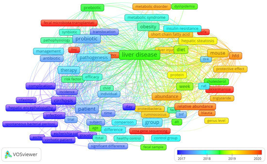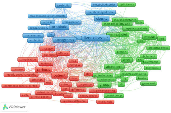 The cluster colored in blue includes, among the most frequent keywords, liver disease, probiotic, obesity, pathogenesis, prebiotic, synbiotic, metabolic syndrome, and disorders.